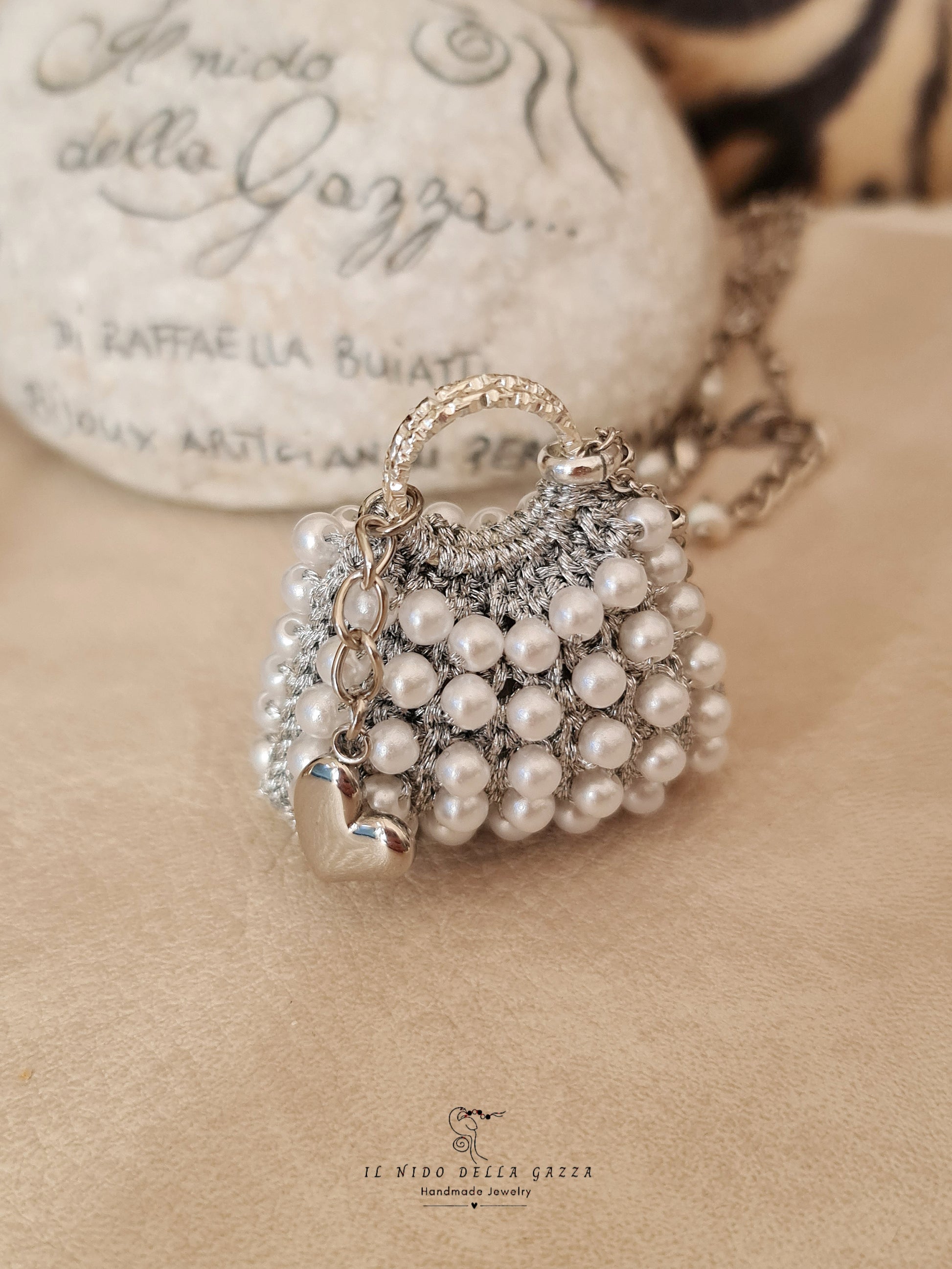 La borsettina è lavorata con la tecnica dell'uncinetto con filato gioiello e perle bianche, impreziosita da un charm a cuore che aggiunge un'aria giocosa e chic alla collana.