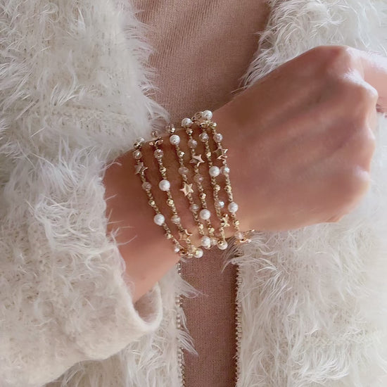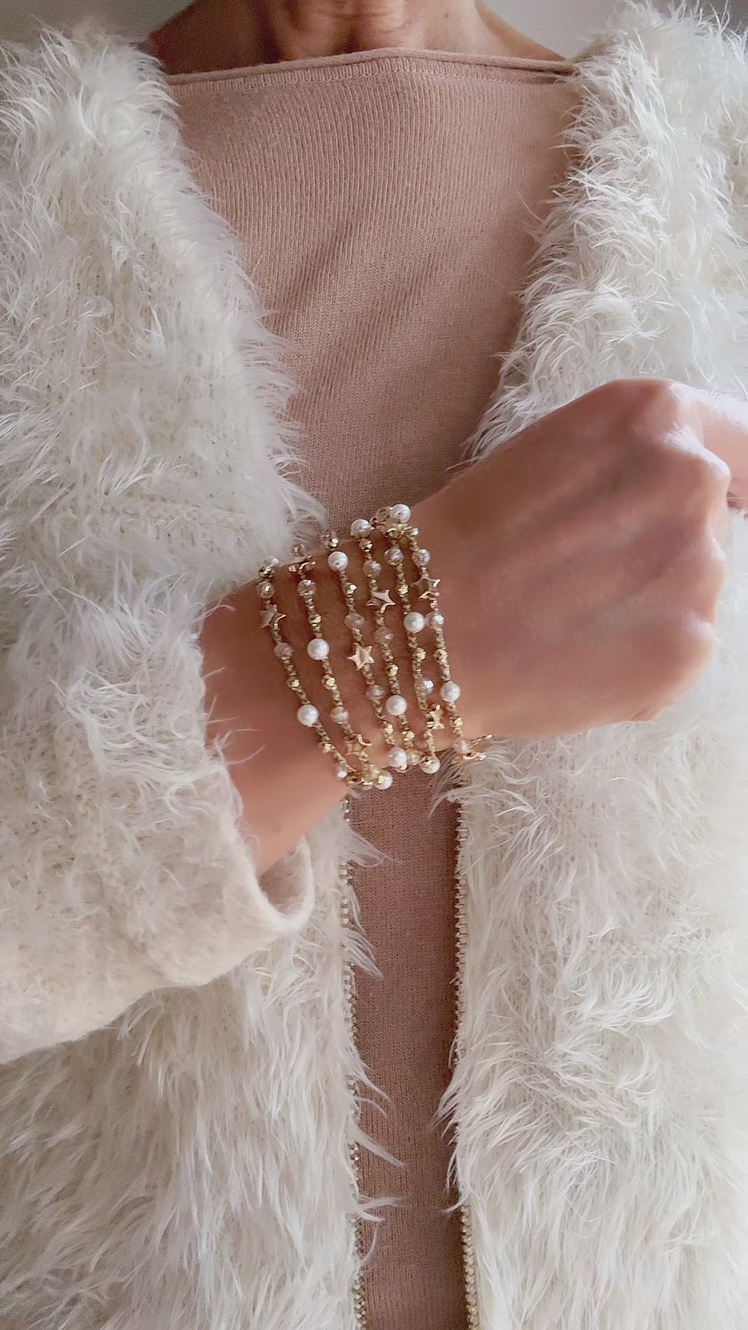 Il filo si intreccia con dolcezza tra cristalli e piccole stelline in acciaio, creando riflessi caldi e dorati.