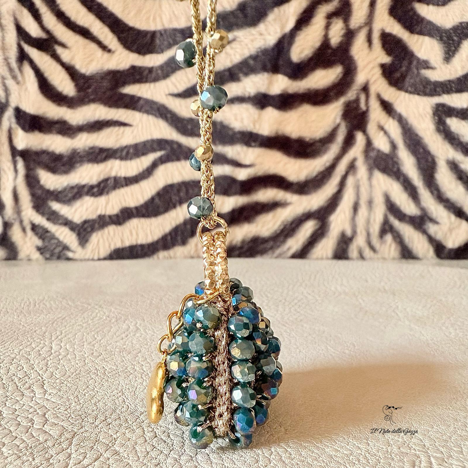 Il ciondolo è realizzato all’uncinetto con filato gioiello, cristalli verde iridescente e un delicato charm a cuore.